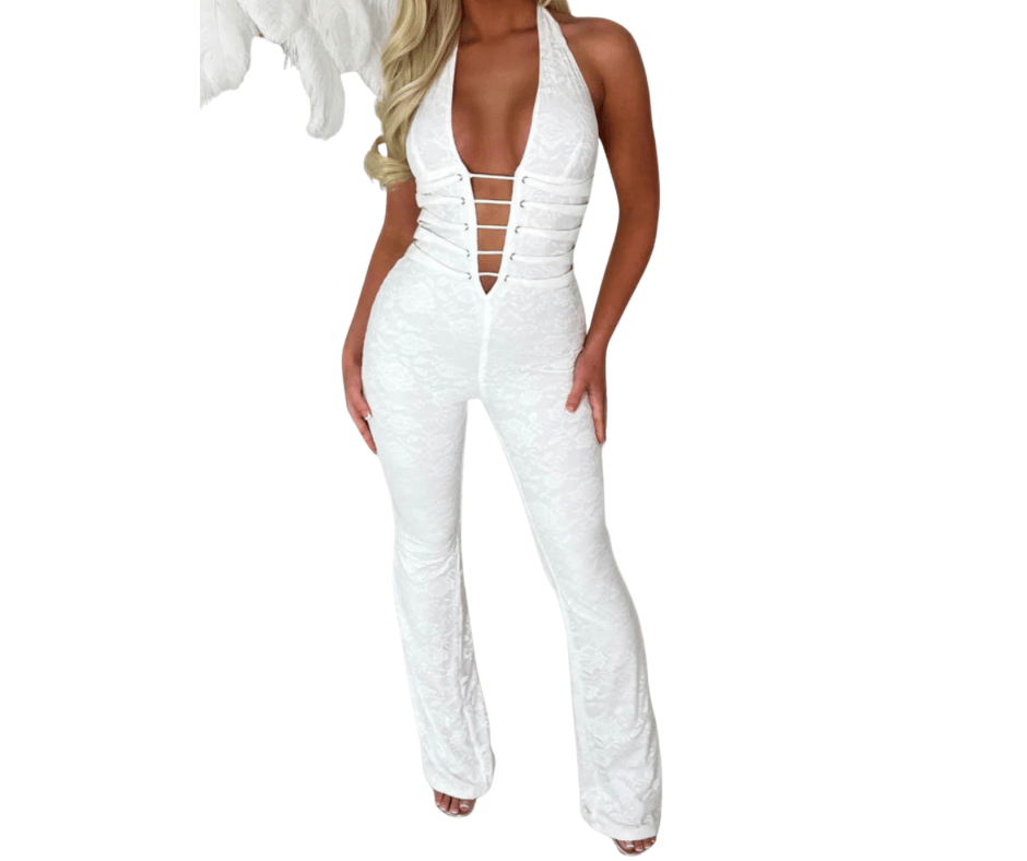 A refined lace jumpsuit with a deep neckline and corset-inspired detailing. Elegant and sculpting, this piece offers a soft yet striking look perfect for elevated occasions.