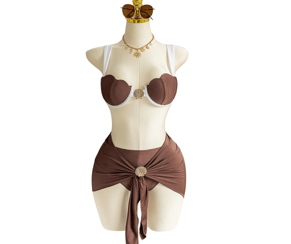 A refined statement piece designed to stand out effortlessly. The Golden Brown Shell Luxe Set features sculpted cups with delicate shell detailing and a matching wrap skirt that enhances your silhouette. Elegant, feminine, and made for elevated beach moments.